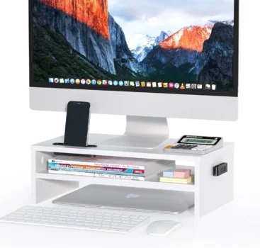 Tired of neck strain from looking down at your monitor? This wooden stand elevates your screen to eye level while organizing your entire desk setup.
